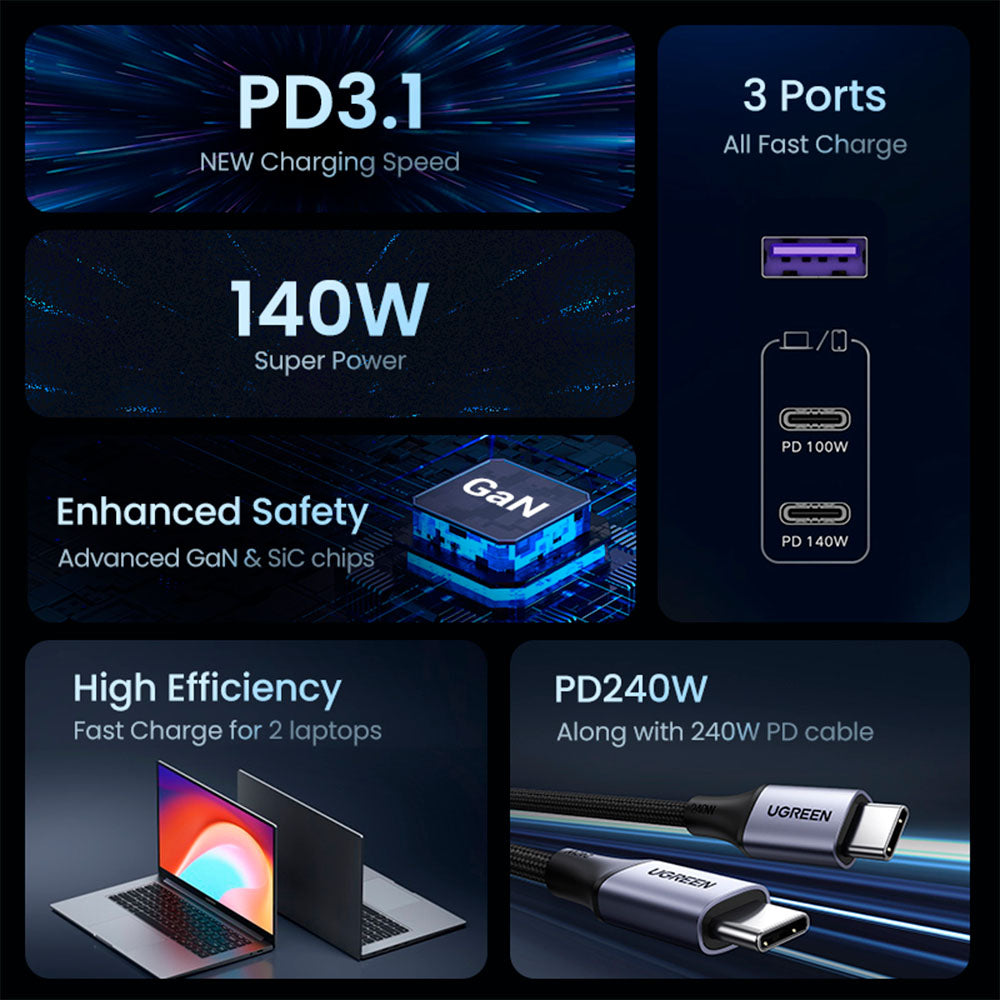 - Salida: USB-C1: 5V=3A 9V=3A 12V=3A 15V=3A 20V=5A 28V=5A 3.3-11V=3A 3.3-21V=5A 140WMax USB-C2: 5 V = 3 A 9 V = 3 A 12 V = 3 A 15 V = 3 A 20 V = 5 A 3,3-11 V = 3 A 3,3-21 V = 5 A 100 W máx. USB-A: 5 V = 4,5 A 4,5 V = 5 A 5 V = 3 A 9 V = 2 A 12 V = 1,5 A 22,5 W máx.