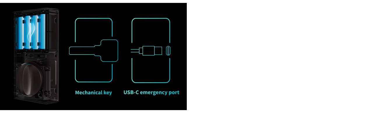 Gracias a la eficiencia energética del protocolo Zigbee, la U100 cuenta con una batería de larga vida de hasta 8 meses (*Uso promedio de 8 aperturas por día) y con baterías AA fáciles de reemplazar cuando salte la notificación de batería baja. En caso de una emergencia, por ejemplo, cuando se agote la batería, usted podrá utilizar la llave física para entrar o utilizar el puerto USB-C del panel para energizar su cerradura.
