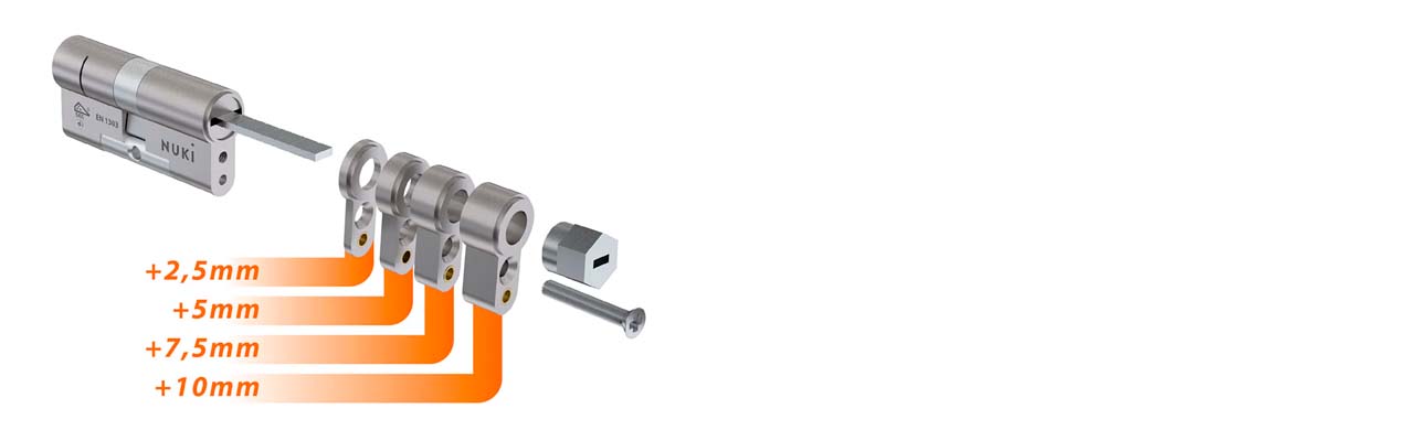 El Nuki Universal Cylinder está diseñado como una solución modular (módulos individuales), contempla todas las dimensiones comunes de los cilindros y se puede adaptar a tu propia puerta. Esto da como resultado 33 posibles dimensiones de cilindro, haciendo que Nuki Universal Cylinder sea compatible con casi todas las puertas.