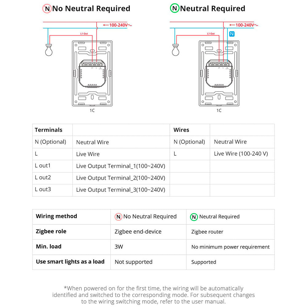 En ningún modo neutro requerido, ZBM5 funciona como un dispositivo final Zigbee. La carga externa debe cumplir con un requisito de potencia mínima de 3W. No es compatible con las luces inteligentes, incluidas, entre otras, las luces regulables, que cambian de color, degradadas y con controladores incorporados y tiras de LED.