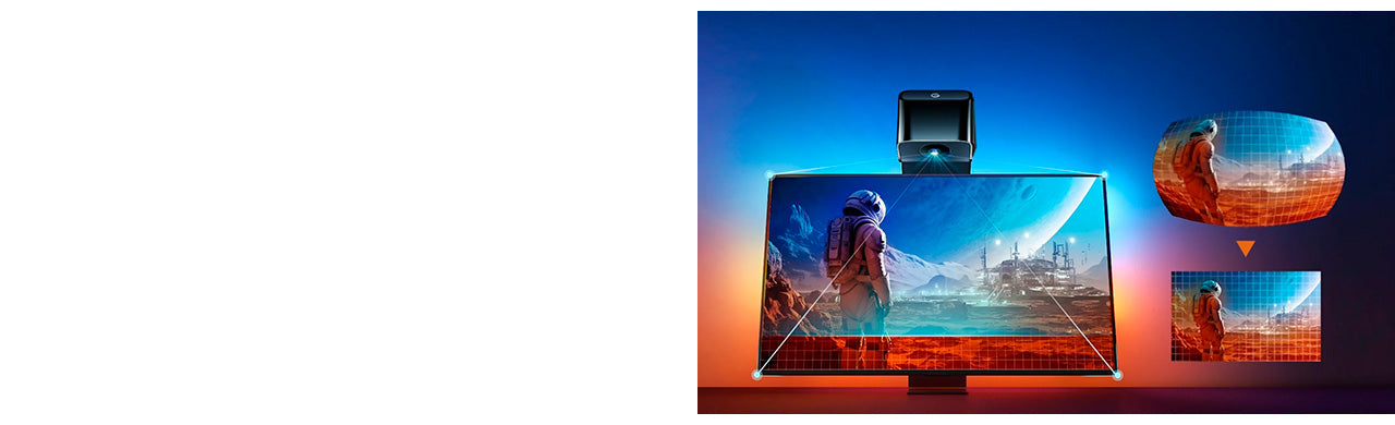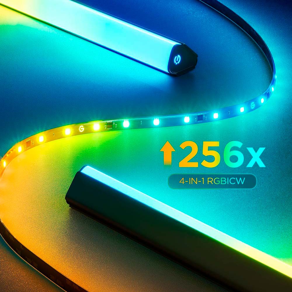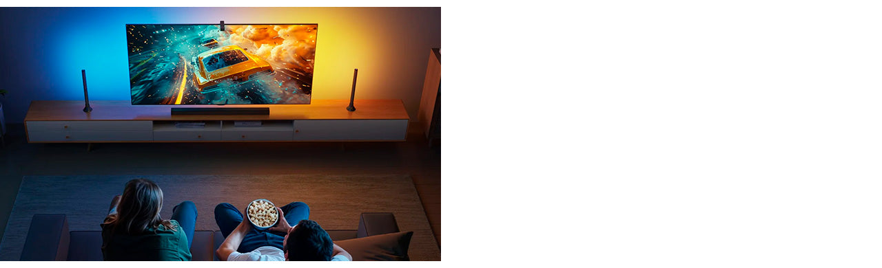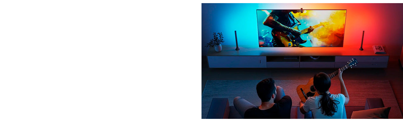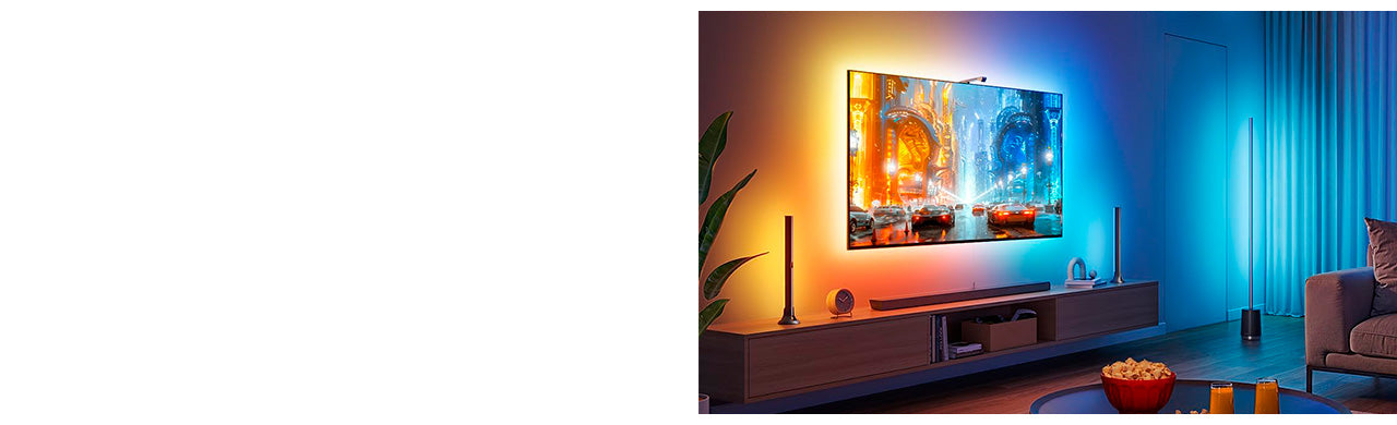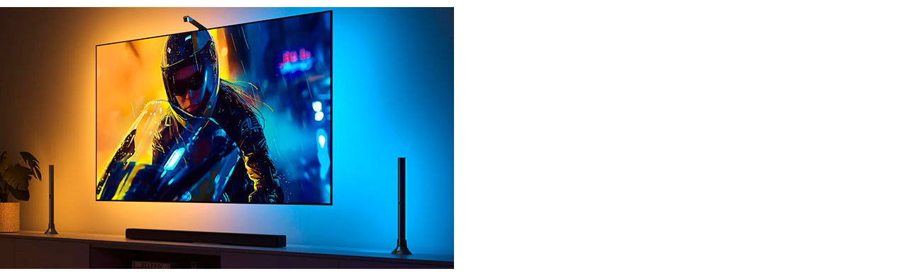 Este kit mejorado combina la retroiluminación LED de TV RGBICW con dos barras de luz inteligentes, equipadas con una cámara de corrección de ojo de pez que amplía el rango efectivo para una combinación de colores más precisa y una iluminación ambiental reactiva más completa.