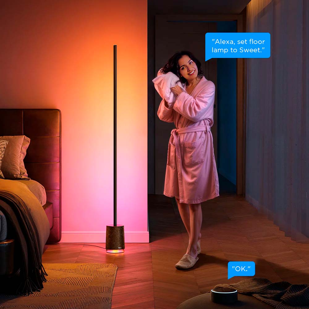 La lampara cuenta con 85 escenas responsivas prediseñadas diferentes las cuales se ajustan a la atmosfera cambiante de cualquier parte de tu hogar, permitiéndote generar efectos lumínicos acorde a cada festividad o situación que desees ambientar con iluminación inteligente.