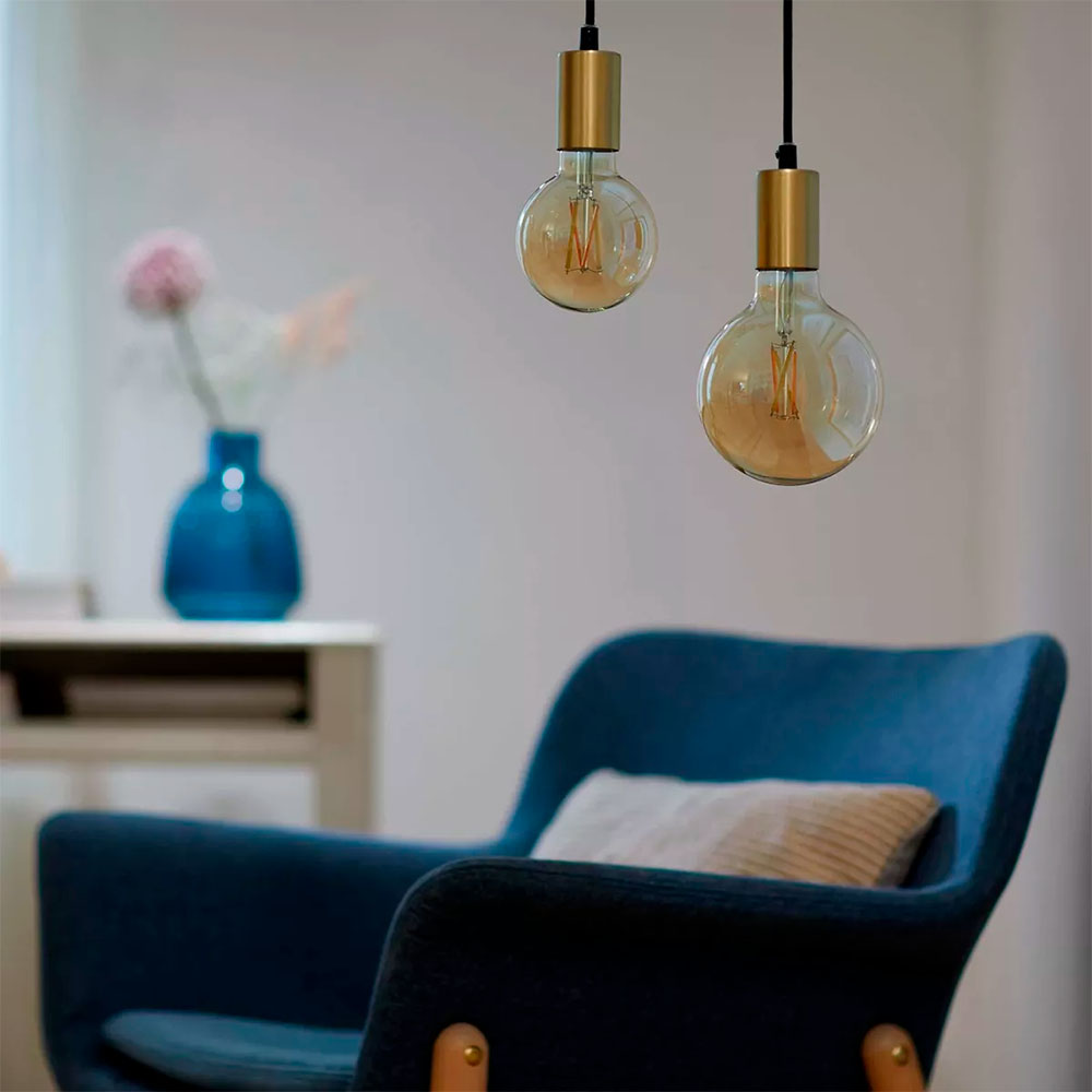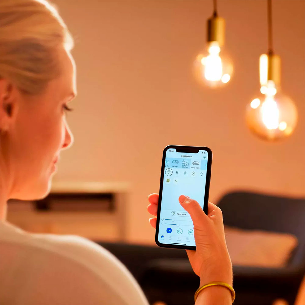 La ampolleta de filamento inteligente se puede utilizar con la aplicación WiZ o tu voz para regular la intensidad e iluminar o usar modos de luz preestablecidos en configuraciones de Wi-Fi.
