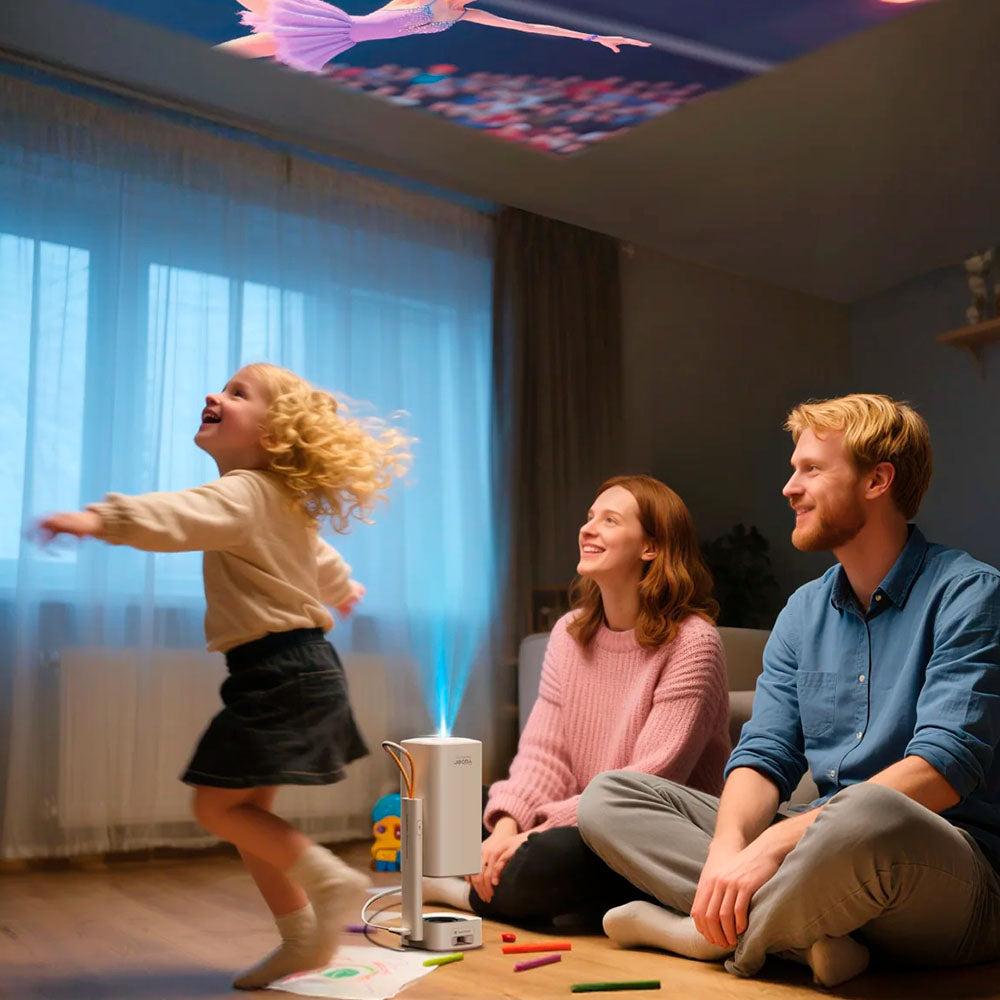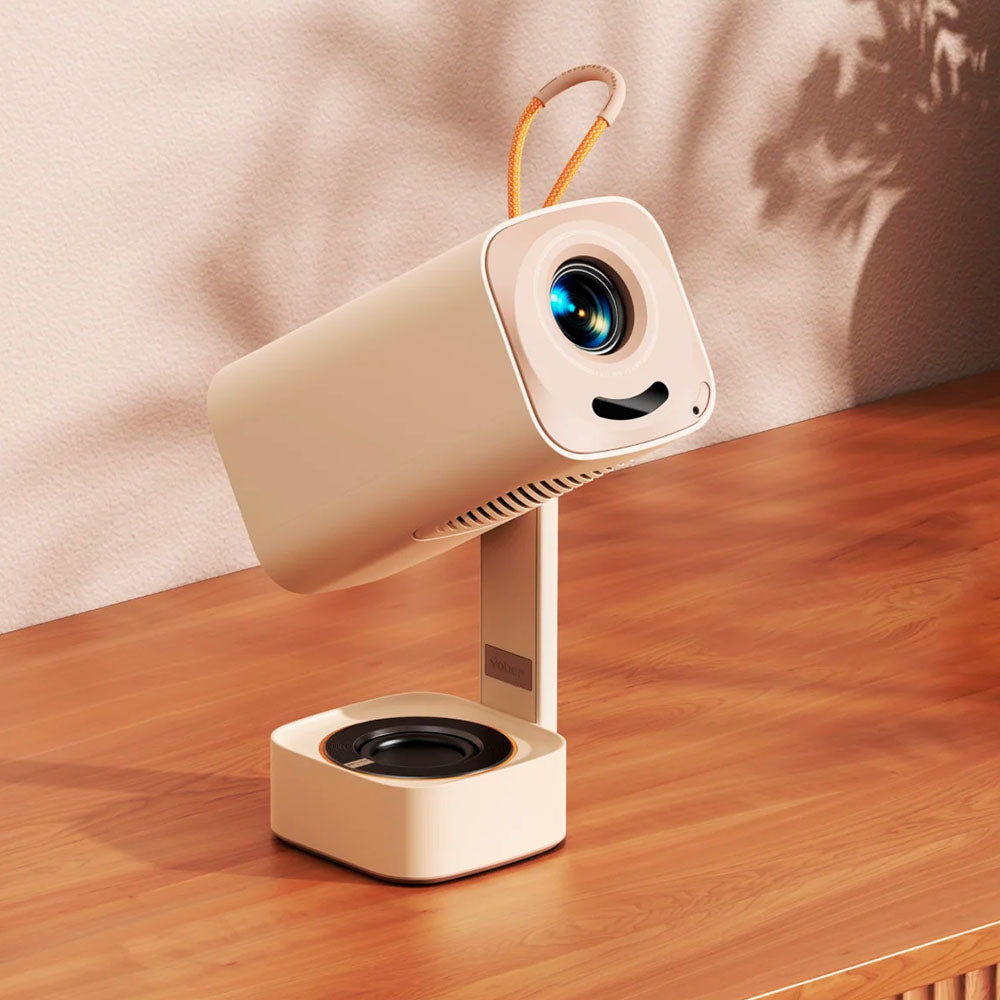 Base tipo gimbal con rotación de 180° para proyectar en techo, pared o ángulos sin accesorios extra; ideal para casa, viajes o presentaciones.