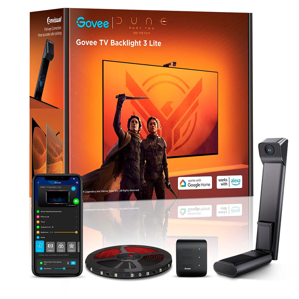 Mejora tus visuales con las tiras Led TV Backlight 3 Lite de Govee. Este set presenta la corrección ojo de pez, remoción de caja de letras, adaptabilidad a TVs ultrafinas, ¡y mucho más! ¡Lleva el contenido de tu pantalla hasta el siguiente nivel! Además, este set temático de Dune Part Two incluye efectos de iluminación temáticas de Dune exclusivos de este Packaging.