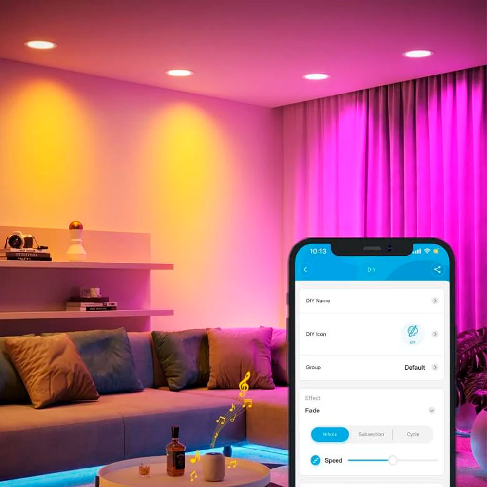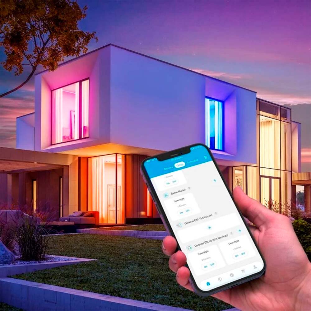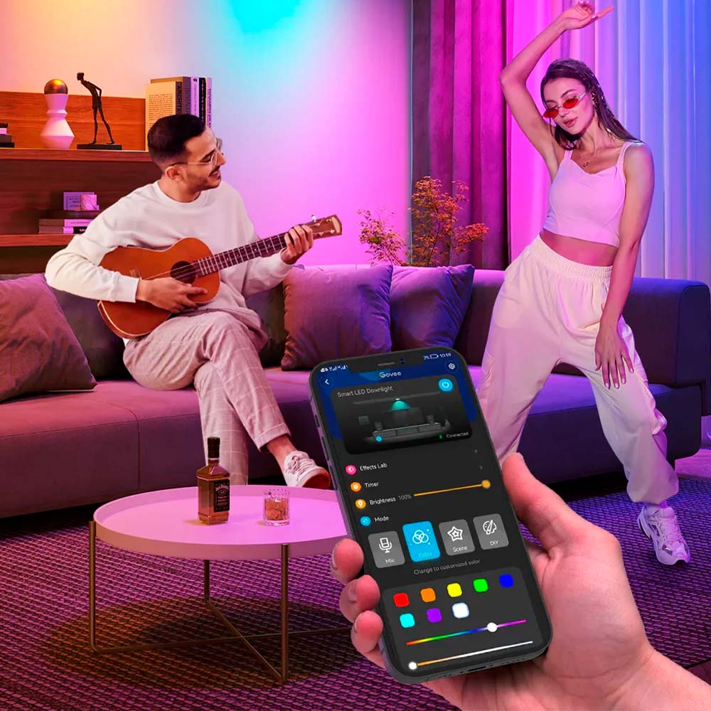 Con las luces empotrables de Govee, no es necesario cambiar los colores o el brillo de estas de manera manual a cada una de las luces, sino que, desde la aplicación, puedes controlarlas todas a la vez, generando el ambiente perfecto en cada habitación o en toda tu casa, y controlarla de manera remota usando la app o tu voz.