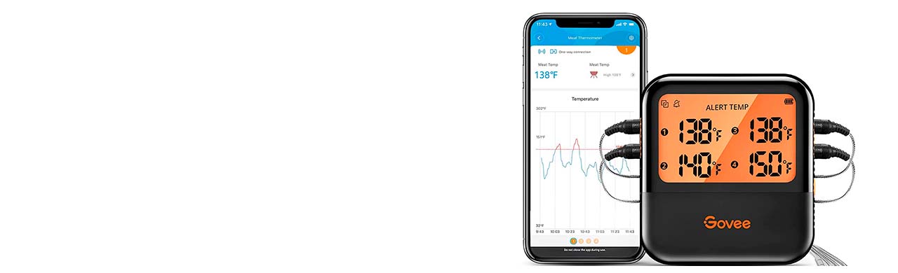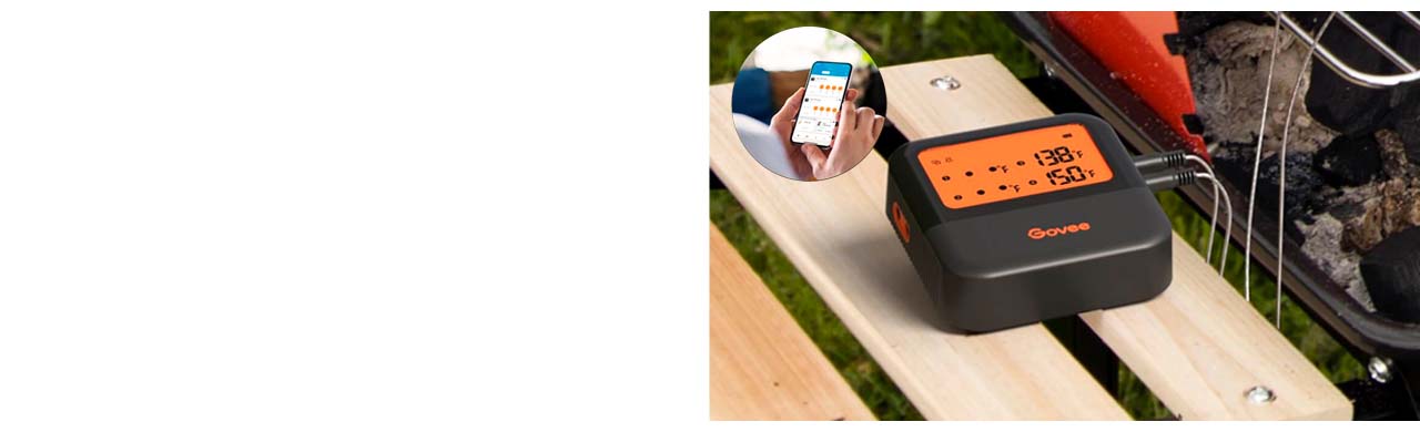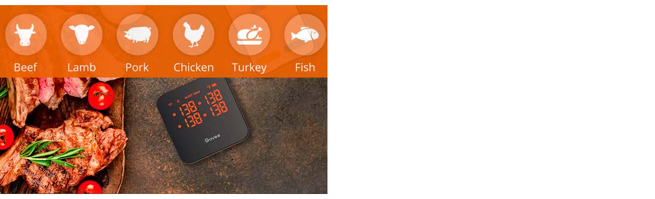 Ahora puedes evitar la molestia de abrir tu parrilla, ya que puedes controlar la temperatura de la carne de forma remota utilizando la aplicación Govee Home dentro de un rango de Bluetooth de 70 metros.