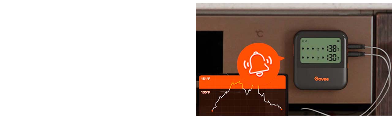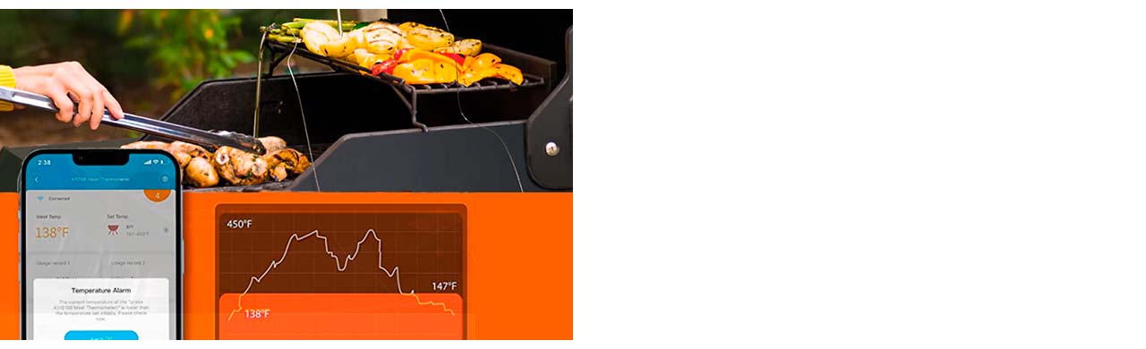 Registra la temperatura de una amplia gama de carnes de forma segura y rápida, con un rango de 150 °C a 300 °C. Si esta excede el nivel de temperatura preestablecido, el termómetro emitirá un pitido y enviará una notificación a su teléfono inteligente.