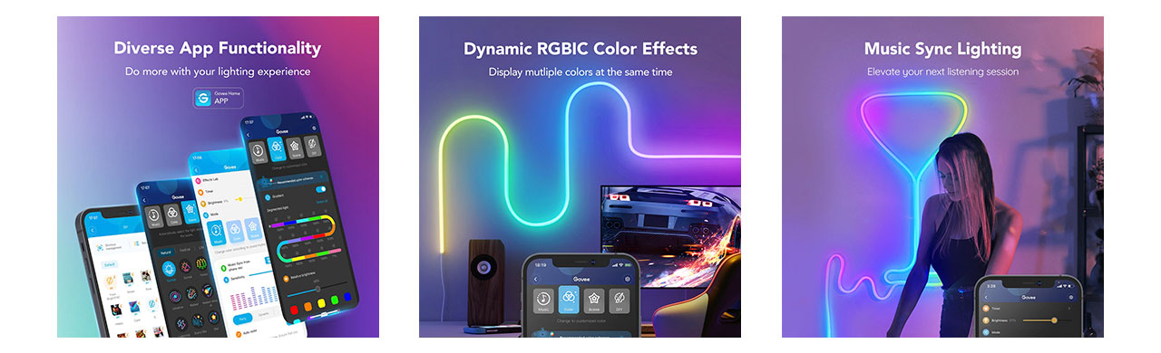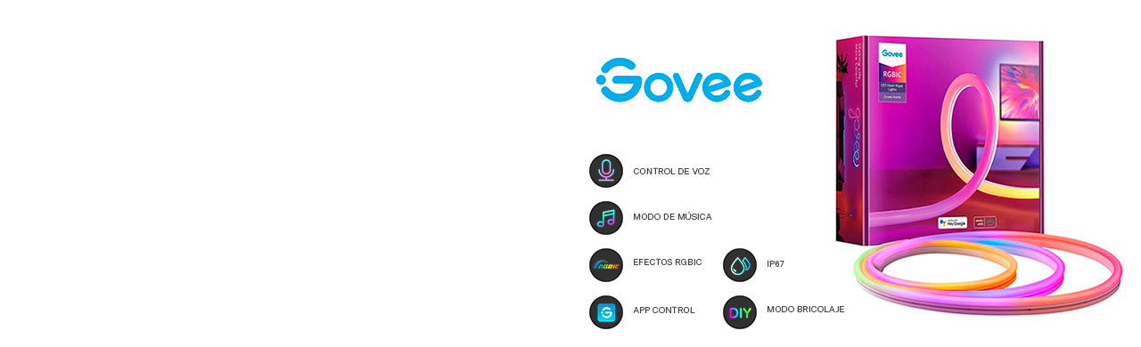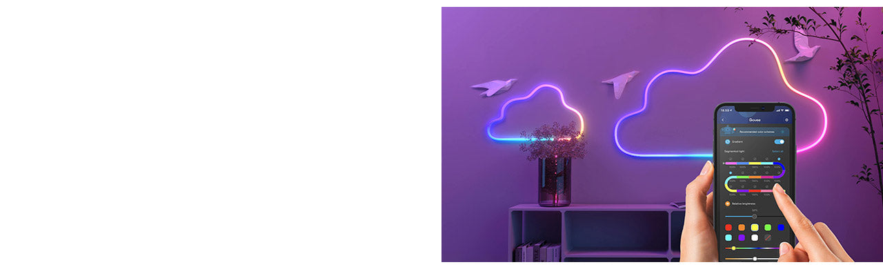 Utilice la aplicación Govee Home para acceder a una selección de efectos de iluminación que mejor se adapte a su estética personal. Controle la luz en segmentos o en la totalidad de la Tira de Neón. Su luz brillará en una variedad de colores parecidos al neón para agregar un ambiente suave y agradable a cualquier parte de su espacio.
