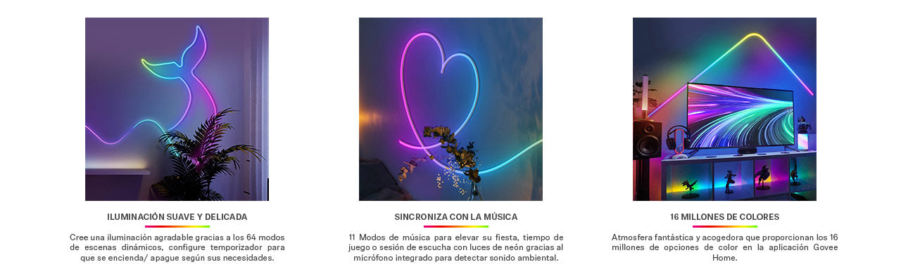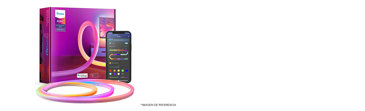 Con las luces de Neón LED usted podrá dejar que su creatividad brille, presentando iluminaciones suaves y delicadas gracias a sus 16 millones de colores, 64 escenas dinámicas, 11 modos de sincronización con la música, control de sectores y todo controlado a través de su Smartphone o su asistente inteligente.